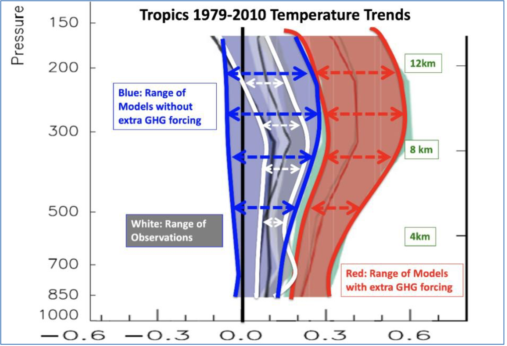 Besonders spannend finde ich das Ergebnis aus dem IPCC Bericht AR5, dass die Modelle mit Treibhausgasen nicht in der Lage sind die Temperaturen in der tropischen Troposphäre zu modellieren und das auch die Modelle aus dem AR6 das nicht verbessert haben.