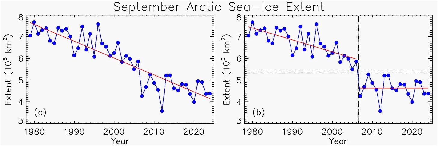 Statistische Tests widerlegen einen einzigen linearen Trend über den gesamten Zeitraum von 1979 bis 2024, wobei Stern feststellt, dass ein stückweises Modell mit einem Bruchpunkt im Jahr 2007 am besten passt. In dieser Anpassung beträgt der Trend für den Zeitraum 1979–2006 −0,55 × 10⁶ km² pro Jahrzehnt, und der Zeitraum 2007–2024 lässt sich am besten durch einen konstanten Mittelwert von etwa 4,63 × 10⁶ km² beschreiben. (Stern).