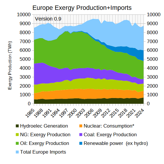 Aus den Daten des Energy Instituts kann man ableiten, wieviel mechanisch nutzbare Energie (=Exergie) in Europa in den letzten Jahren produziert wurde. Die Differenz vom Verbrauch zur Produktion wurde durch Importe ergänzt.