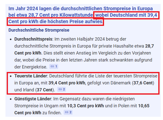 Ich würde gerne mal auf die Zeile unten im Bild eingehen… der böse französische Atomstrom, der zu 75% subventioniert wird. Es ist noch nicht lange her, das las ich, dass der ungarische Strompreis auch ganz übel subventioniert würde. Er ist per Gesetz gedeckelt, soviel ich erkennen konnte, aber wo eine massive Subvention herkommen, war erst einmal nicht zu erkennen. Nach einer Weile war ich dann soweit, dass der eigentliche Marktpreis in HU laut einer Quelle 67 Ct/kWh wäre… dann wäre er ja tatsächlich mit über 50 Cent subventioniert… wenn man weiter bohrt findet man aber keinerlei Basis für die astronomischen 67 Ct/kWh… Auch der „Copilot“ musste mir dann zustimmen, als ich die These „Bullshit“ geäußert habe. 🙂