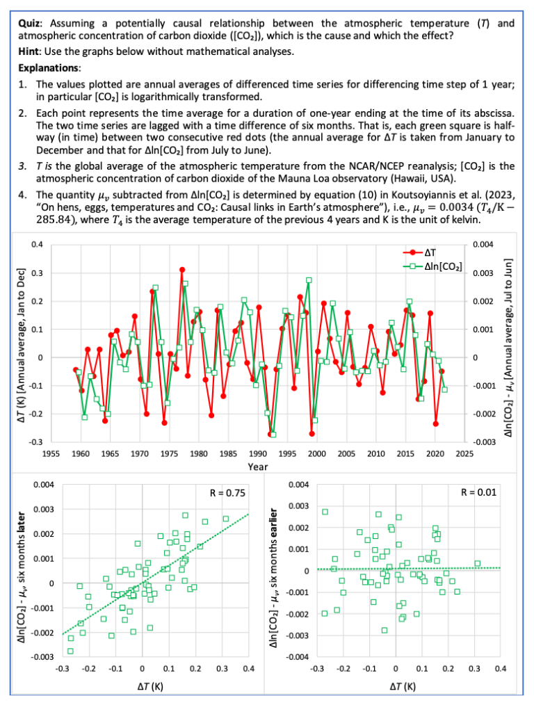 · Koutsoyiannis, D., et al. (2023). On Hens, Eggs, Temperatures and CO2: Causal Links in Earth’s Atmosphere, Sci 2023, 5, 35. https://doi.org/10.3390/sci5030035