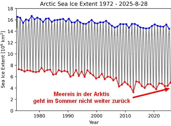 In den letzten zwei Jahrzehnten hat sich der Rückgang des arktischen Meereises erheblich verlangsamt, wobei seit 2005 kein statistisch signifikanter Rückgang der Meereisfläche im September zu verzeichnen ist. Diese Pause ist in allen Beobachtungsdatensätzen, Messwerten und Jahreszeiten stabil. … Die Modellierungsergebnisse deuten darauf hin, dass die interne Variabilität den anthropogen bedingten Meereisverlust in den letzten Jahrzehnten weitgehend ausgeglichen hat.