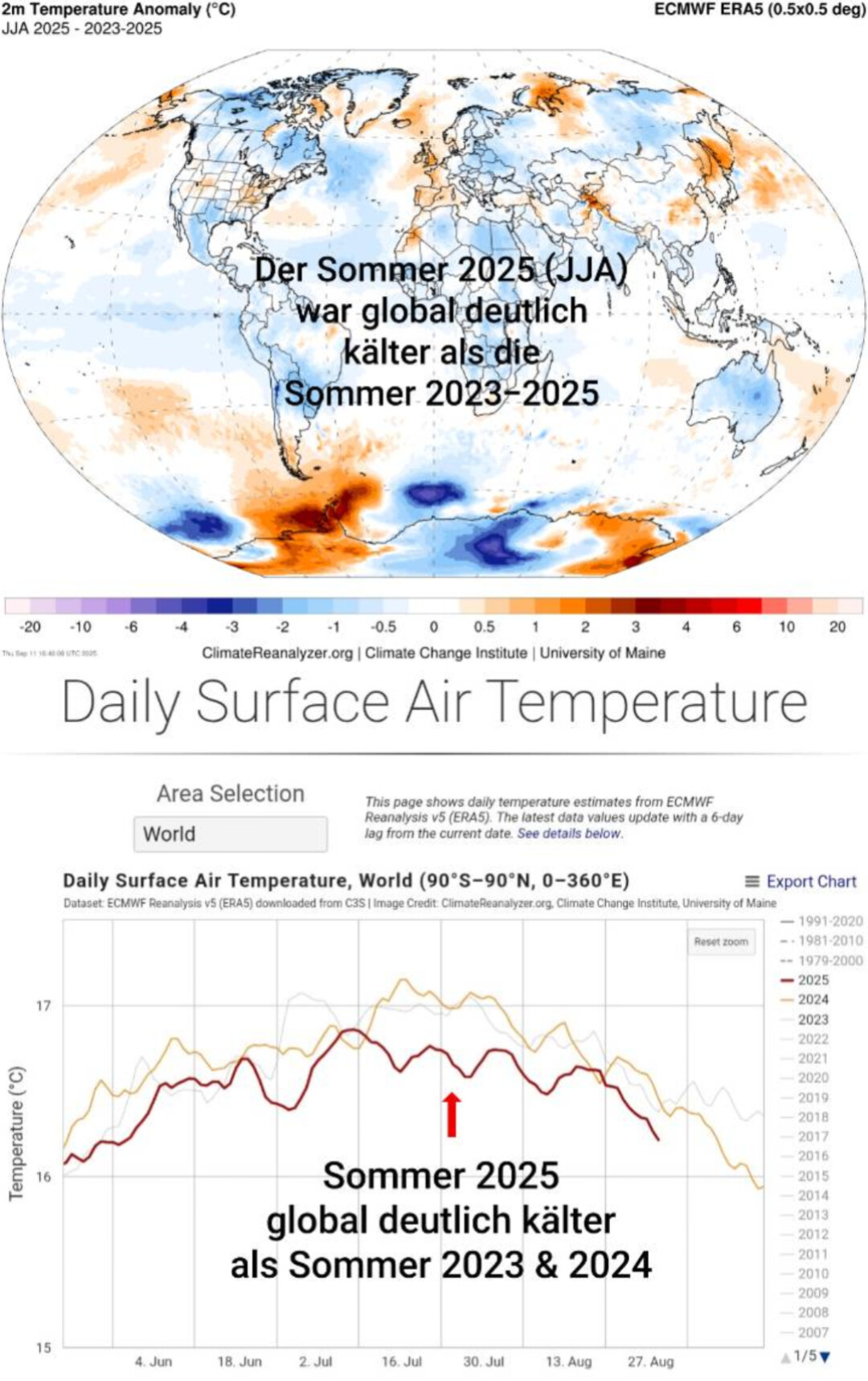 Global war der Sommer 2025 eher kalt zu den vorangegangenen Sommern. Nur in Spanien gab es eine leichte positive Anomalie. Auf die alle aufgesprungen sind.