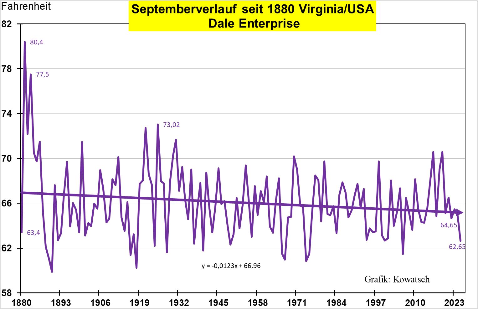 Aktualisierung von Josef Kowatsch: Dieses Phänomen können wir voll bestätigen. Wir haben direkten Zugang zu den Daten der ältesten Wetterstation in Viginia, der Dale-Enterprise wheather station bei einer Farm. Es war der 10.kälteste August seit 1880!! https://wrcc.dri.edu/cgi-bin/cliMAIN.pl?va2208 Auch der September liegt mit bisher mit 62,65°F weit unter dem Schnitt des seit 1880 deutlich kälter werdenden Septembers in Virginia. Dabei haben wir Anfang September und gegen Ende wird der September in der Regel auch bei uns noch kälter.!!!