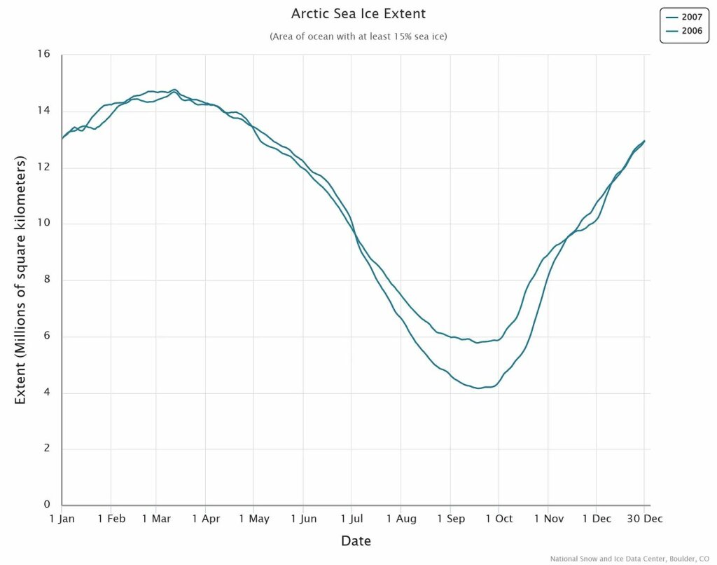 Vorher und nachher: 2006 bis 2007 – fast 2 Millionen Quadratkilometer Eis sind verschwunden. [NSIDC]