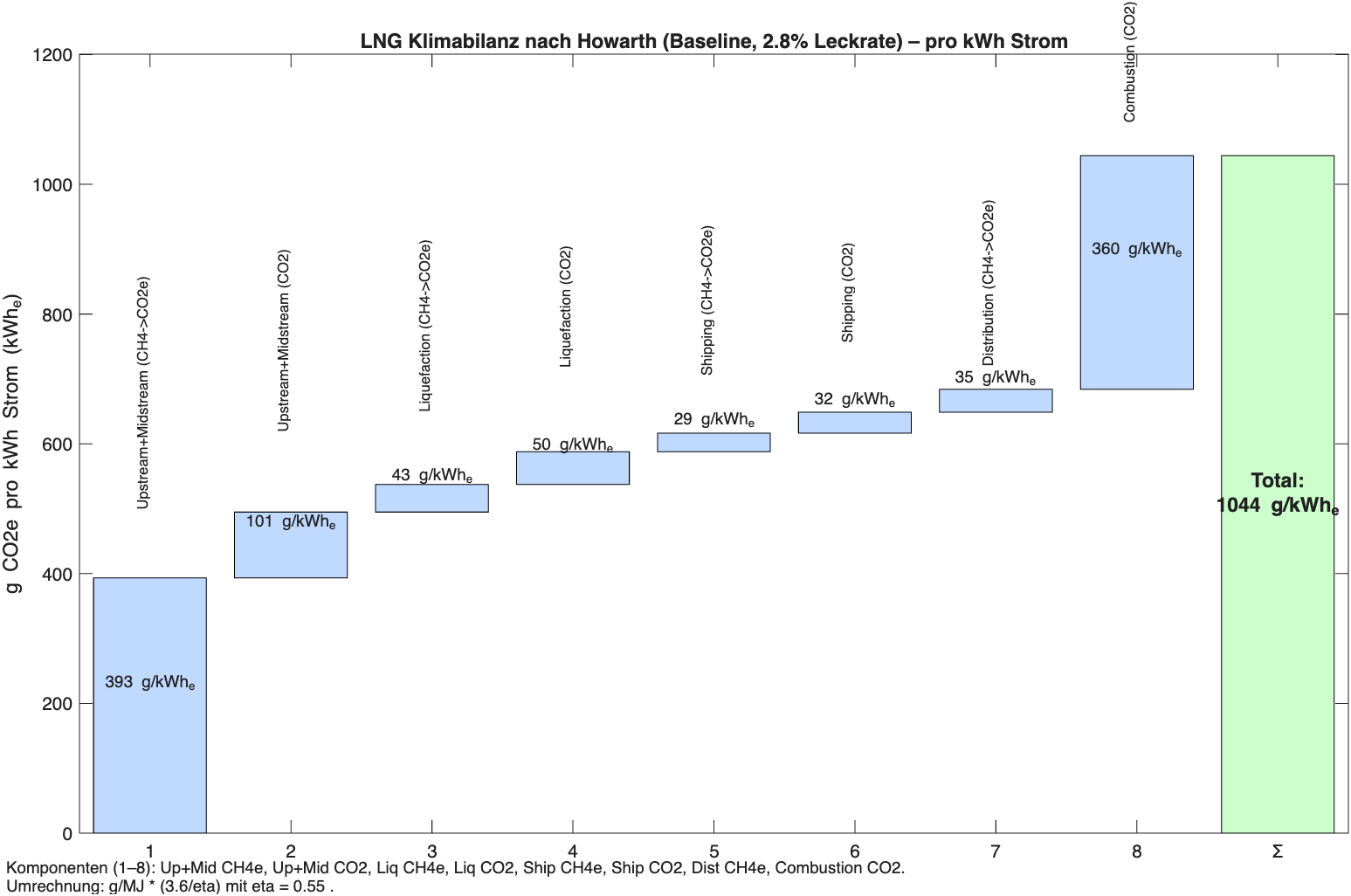 Das Wasserfalldiagramm zeigt die Beiträge entlang der LNG-Wertschöpfung: Methan aus Upstream/Midstream (Vorkette) ist ein großer Einzelposten zusammen mit CO2 aus der Endverbrennung. Liquefaction, Shipping und Distribution sind kleinere, aber nicht zu vernachlässigende Beiträge. Insgesamt ergibt sich (bei η = 55 % Wirkungsgrad des Gaskraftwerkes) eine Klimabilanz von rund 1.040 g CO₂e/kWhₑ(CO2-Äquivalente). Damit liegt LNG auf gleichem Niveau wie Kohle (typisch 900–1100 g CO₂/kWhₑ). Entscheidend: Der Methananteil in der Vorkette frisst den Effizienzvorteil von Gas gegenüber Kohle nahezu vollständig auf.