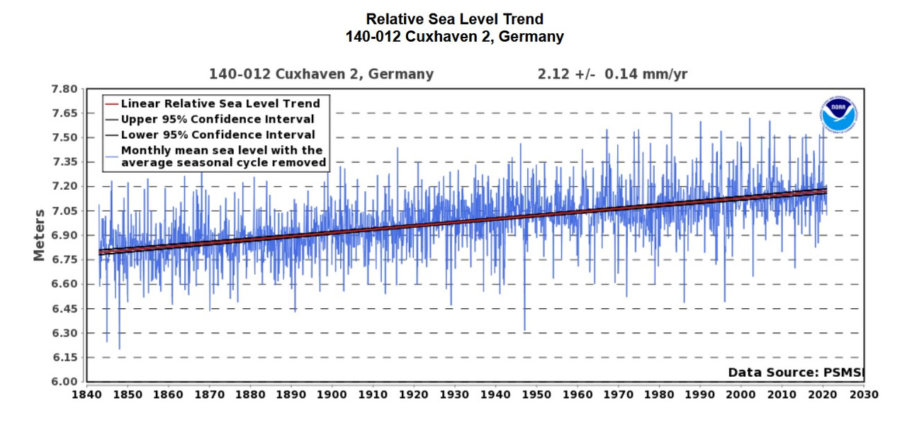 Ach so, das Foto im Beitrag zeigt Cuxhaven. Dank Herrn Kraus wissen wir jetzt, dass dort der Meeresspiegel nicht beschleunigt steigt, sondern nur mit 2 mm pro Jahr.
