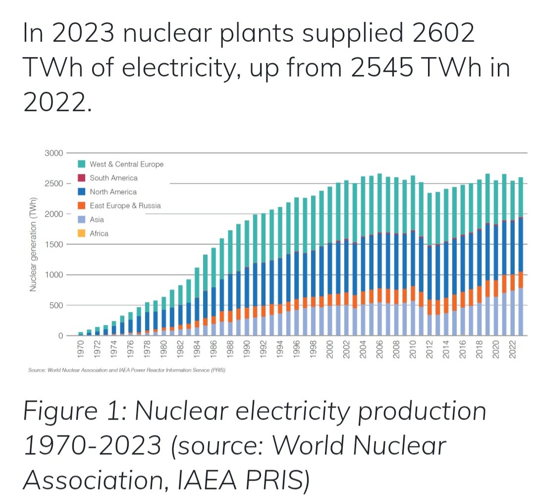 Das Maximum an TWh bei den Atomkraftwerken war aber 2006 mit ca. 2661 TWh und 2024 waren das nur ca. 2618 TWh, das ist ein Rückgang vom jemals erreichen Maximum an TWh von ca. -43 TWh, so sind die Zahlen bei der IAEA.