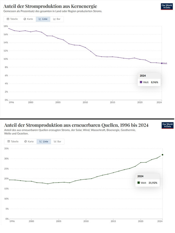 da muss ich leider etwas Wasser in Ihren Wein gießen. Der von Ihnen kolportierte Rückgang des Anteils der Kernenergie am globalen Strommix ist relativ, nicht absolut. Und das ist ein entscheidender Unterschied, den Sie übersehen.