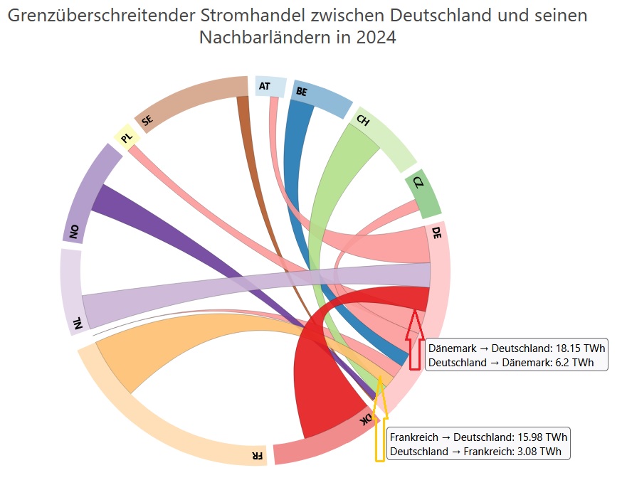 Im Jahr 2024 importierte Deutschland netto Strom aus Dänemark und Frankreich in folgenden Mengen (basierend auf Daten der Bundesnetzagentur und SMARD; Netto-Importe = Import minus Export):