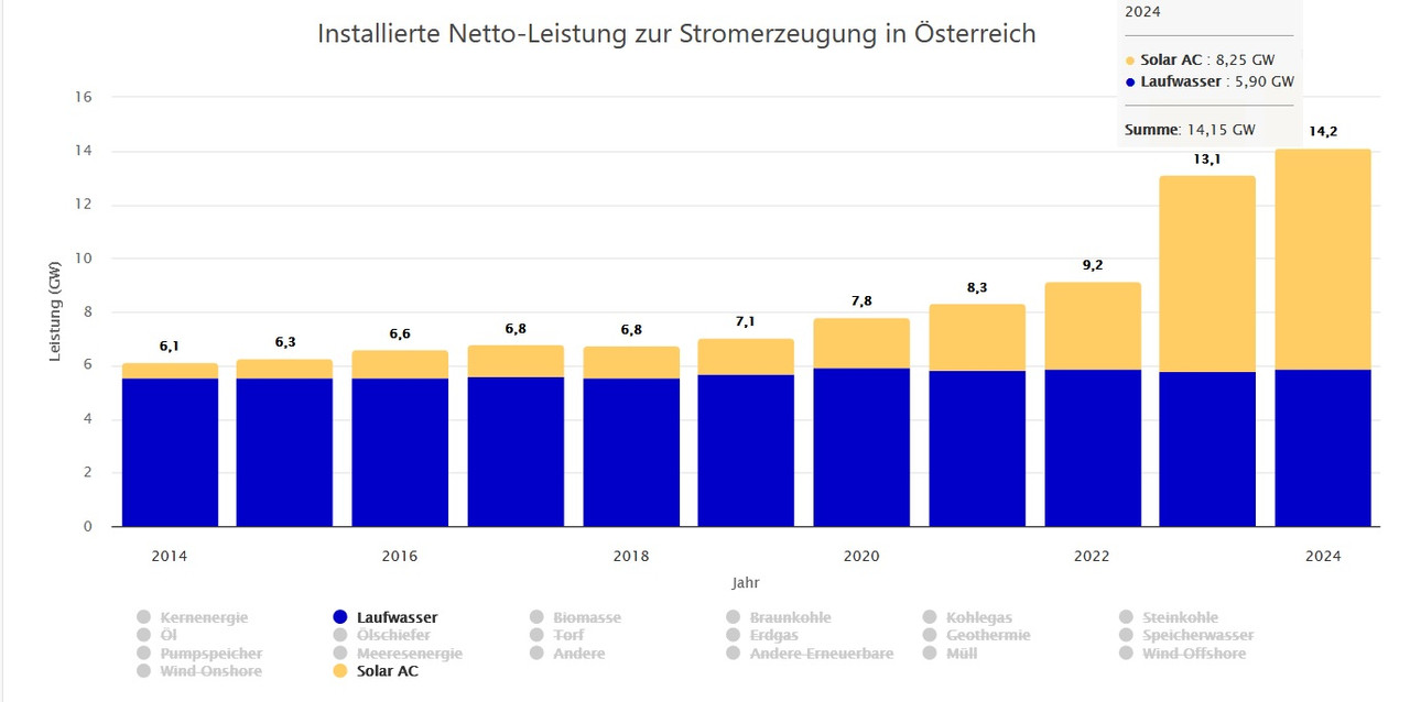 Auch in Österreich wird PV-Strom ausgebaut, Wasserkraft stagniert auf dem Istzustand.