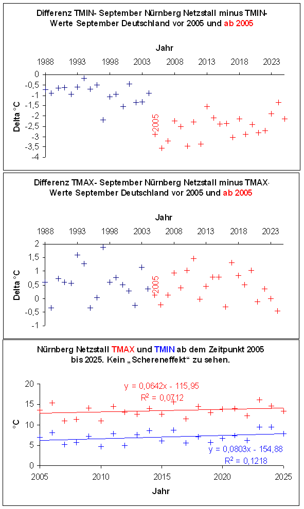 Versuch einer Erklärung: In Netzstall (umgeben von Wiesen und Wald) ist die Luft sehr sauber. Die Septembersonne heizt tagsüber auch den trockenen Boden des ländlichen Standortes kräftig auf. Wegen den Trockenlegungen der deutschen Böden kühlen die ländlichen Standorte nächtens viel stärker aus. (Prinzip der Wüste) Eine allgemeine CO₂-Abkühlungsbremse aufgrund einer angeblichen Treibhaus-Gegenstrahlung, die auf dem Lande genauso wie in der Stadt wirken müsste, ist nicht erkennbar.