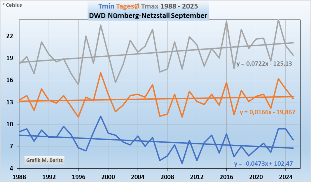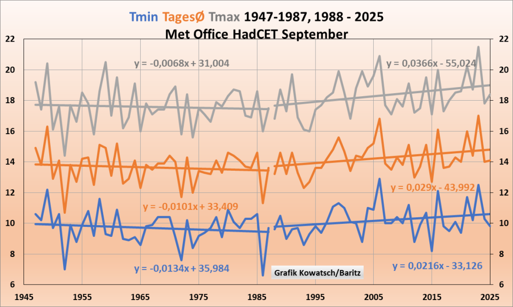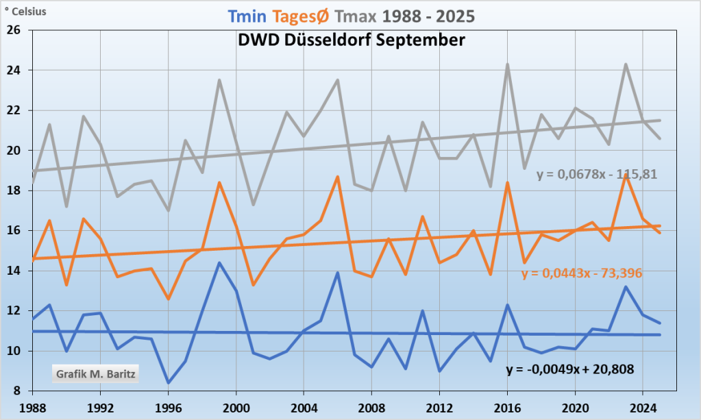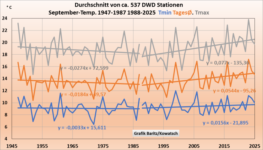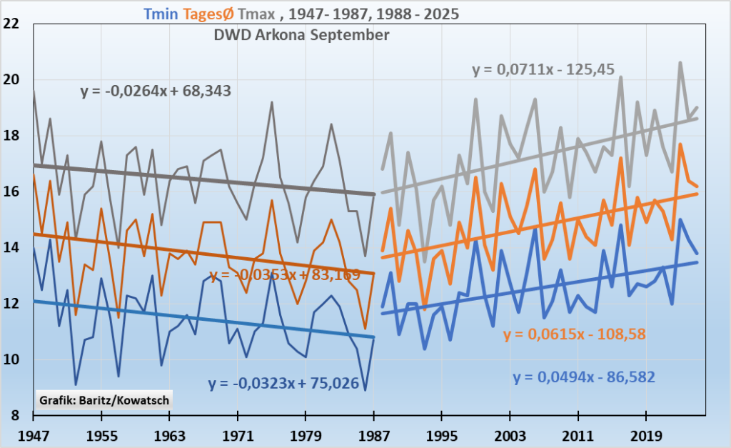 - Der September wurde nur tagsüber und erst seit 1988 wärmer, davor war 45 Jahre Abkühlung -Die Nachttemperaturen haben nicht zugenommen -CO₂-Erwärmungssignale sind aus den DWD-Temperaturreihen nicht erkennbar.