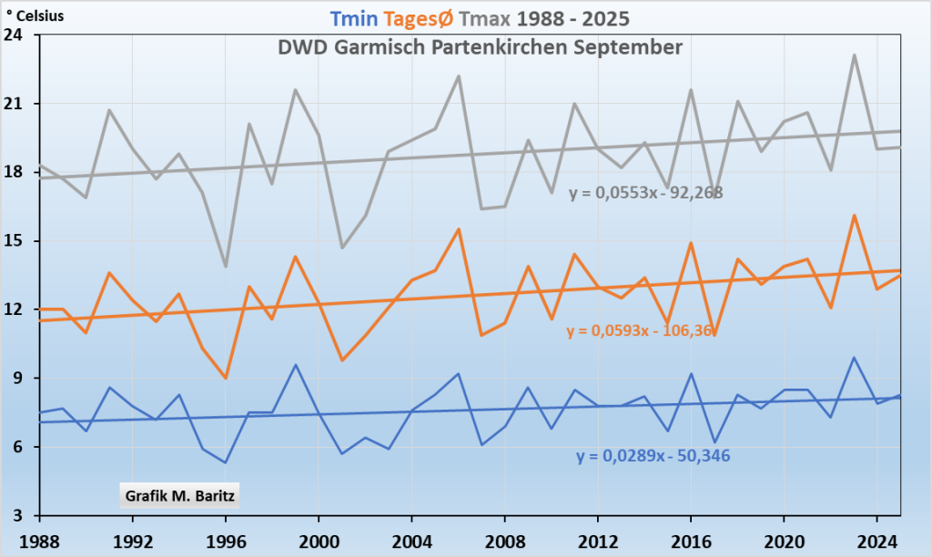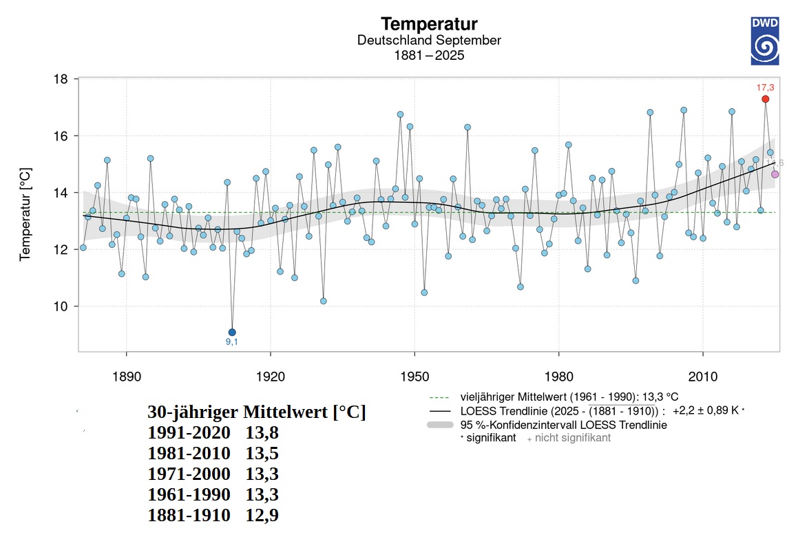 Leider hat Herr Kraus in seinem Kommentar ( 06. Okt. 09:52) die Loess-Trendlinie (Grafik) gepostet (Sept. 25, 2,2 Grad zu warm), aber …..Septembertemperaturen 2021, 2023 und 2024 lagen ca. 1,5 °C über dem dreißigjährigen Mittelwert 1991-2020…. mit der 30jährigen Vergleichsperiode durcheinander gebracht.