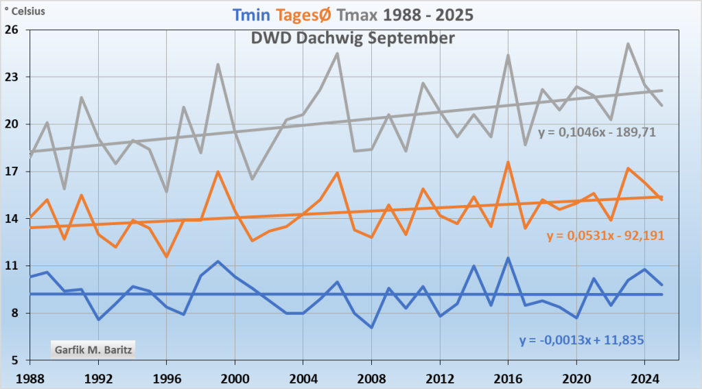 Die Tagestemperaturen (T-max) kühlen deutlich ab zwischen 1947 und 1987, ab 1988 bis heute ändert sich schlagartig die Richtung. Die Temperaturen am Tage steigen bis heute kräftig an. Und da wir tagsüber wach sind, hat jeder Naturbeobachter diese angenehme Septembererwärmung seit 1988 mitbekommen. Wir hoffen, dass diese Erwärmung am Tage noch länger andauert.