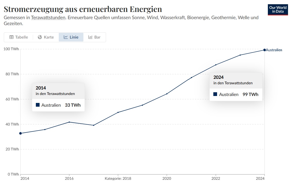 In Australien sind die TWh Strom aus den erneuerbaren nach oben geschossen.