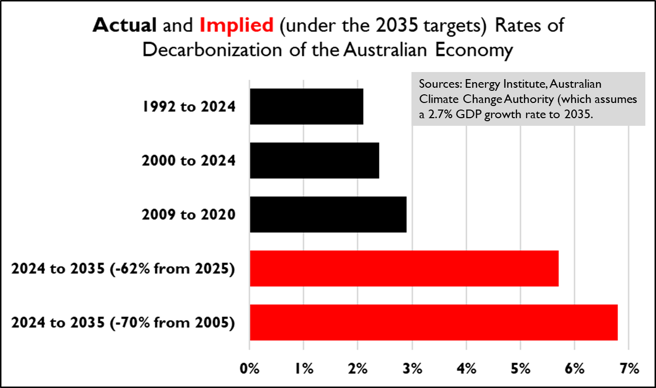 Die impliziten Dekarbonisierungsraten, die durch die roten Balken dargestellt werden, gehen gemäß den Annahmen der australischen Klimabehörde davon aus , dass das BIP bis 2035 jährlich um 2,7 % wachsen wird.2