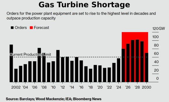 Diese Gaskraftwerke können niemals in den nächsten 5 Jahren gebaut werden. Es gibt weltweit im wesentlichen drei Hersteller von Gasturbinen: Siemens Energy (24 % Marktanteil), GE Vernova (25 %) und Mitsubishi (22%), die über 70 % des Marktes bedienen. Diese Hersteller sind bis zum Jahre 2030 vollständig ausgebucht. Die notwendigen deutschen 70 Gaskraftwerke sind daher in der Planung der Gasturbinenhersteller (s.u. Quelle Bloomberg ) noch nicht enthalten.