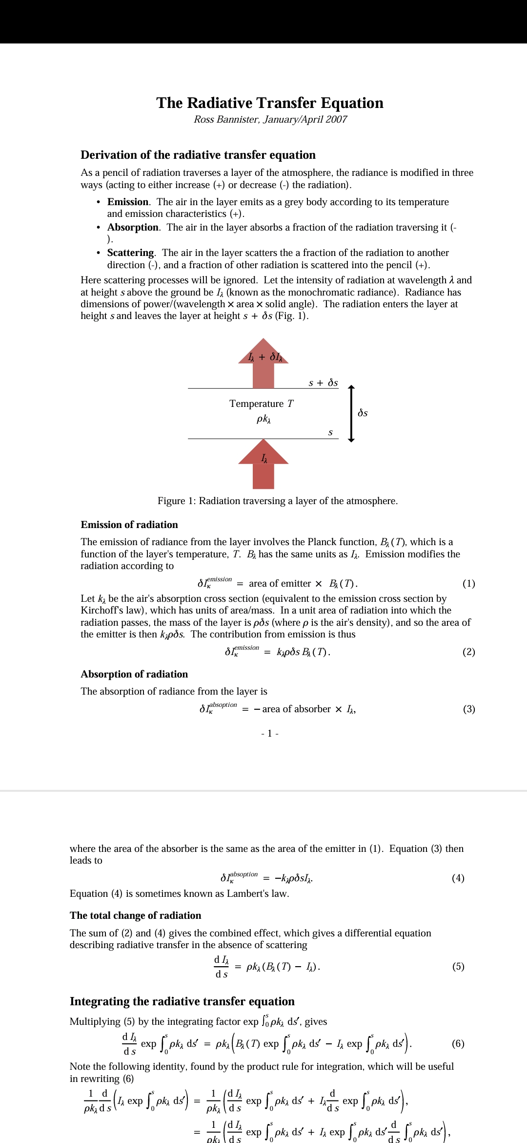 Die Strahlungstransportgleichung als Fundamente der Klimamodellierung beruht auf der Bilanz der atmosphärischen Wärmestrahlungssenke (Absorption gemäß Lambert-Beer-Bouguer) mit der Wärmestrahlungsquelle (Planck‘sche Strahlungsgleichung). Anschaulich und stark vereinfacht gilt: