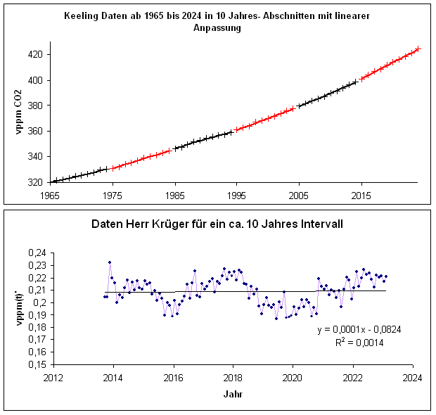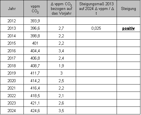 Der von der WMO gemeldete „Rekordanstieg” von 3,5 ppm klingt dramatisch – bis man sich daran erinnert, dass der CO₂-Gehalt seit 2010 durchschnittlich um etwa 2,3 ppm pro Jahr gestiegen ist. Eine Abweichung von 1,2 ppm über ein Jahr ist statistisch insignifikant, insbesondere wenn man bedenkt, dass die Messwerte am Mauna Loa je nach globalen Bedingungen von Jahr zu Jahr um 1 bis 3 ppm schwanken.