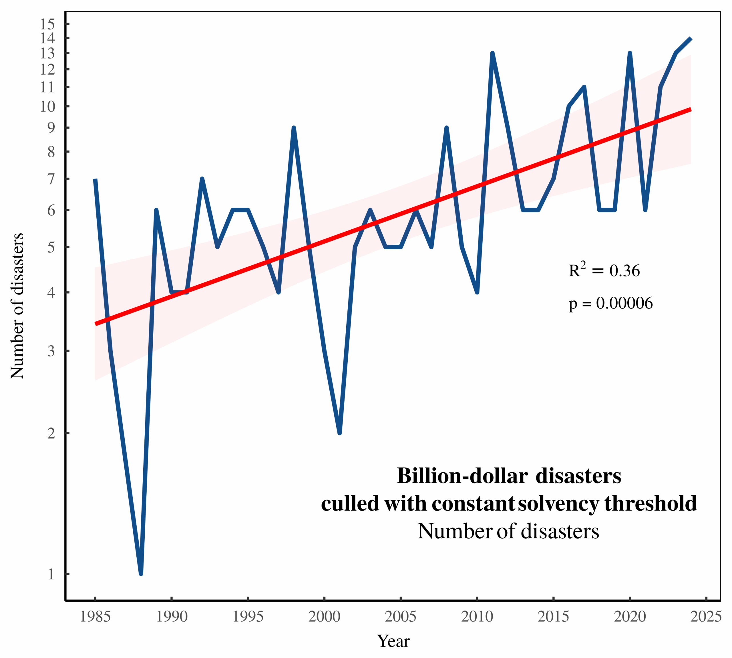 Sein Diagramm 6 zeigt deutlich, wie die Häufigkeit von „Milliarden-Dollar-Katastrophen“ zunimmt. Um den Faktor 3 von 1985 bis 2025.
