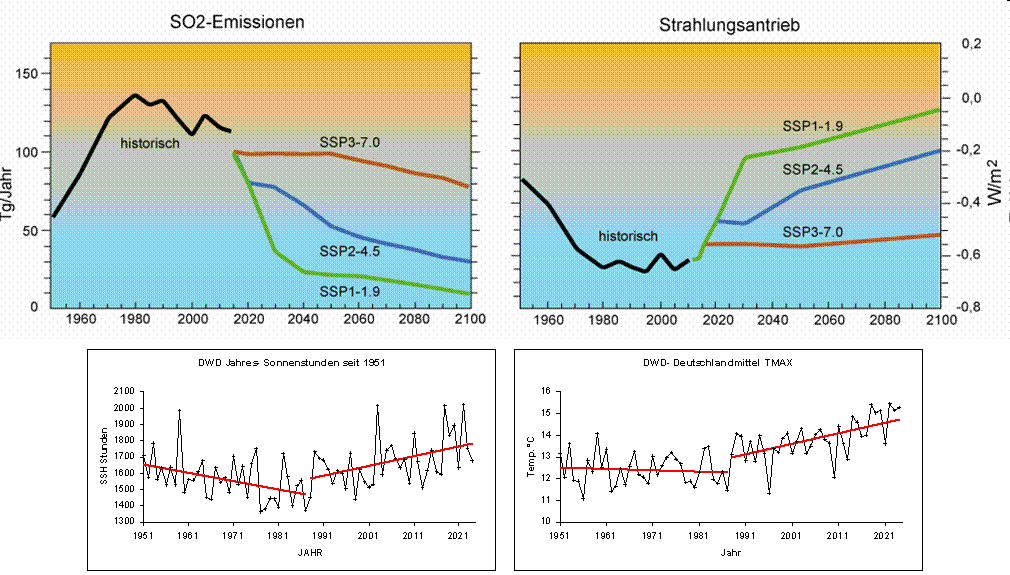 Diese zeigen dass die Zunahme des Aerosolbildenden Schwefeldioxids aus den 50-er Jahren kommend bis Mitte der 80-er Jahre (global) auch einen Rückgang der Sonnenstunden (Deutschland) in diesem Zeitraum bewirkt.