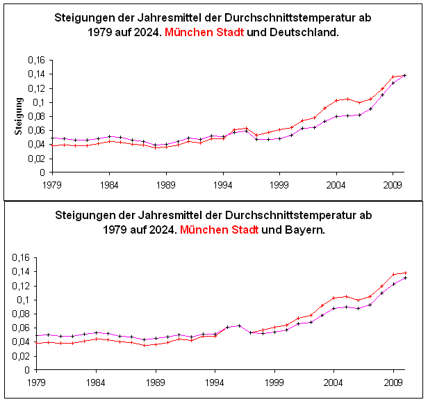 Im Anhang sind die Steigungen der Jahresmittel der Durchschnittstemperatur auf 2024 von München und Deutschland für einen dynamischen Zeitraum ab 1979 bis 2010 für München Stadt sowie für Deutschland und Bayern aufgeführt.