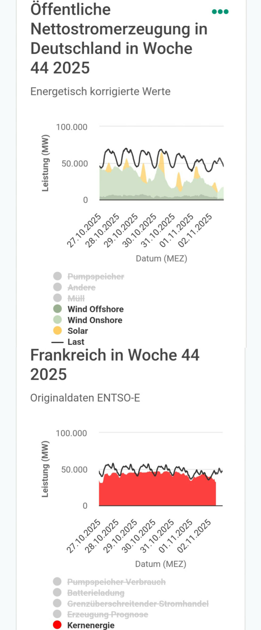 Hier mal der Unterschied zwischen Deutschland und Frankreich. Deutschland muss foss. Strom und Importe zuschalten. In Frankreich geht die Stromversorgung fast komplett mit klimaneutralen Atomstrom. Rund um die Uhr.