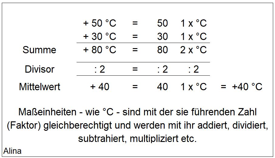 Maßeinheiten – wie °C – sind mit der sie führenden Zahl (Faktor) gleichberechtigt und werden mit ihr addiert, dividiert, subtrahiert, multipliziert etc.