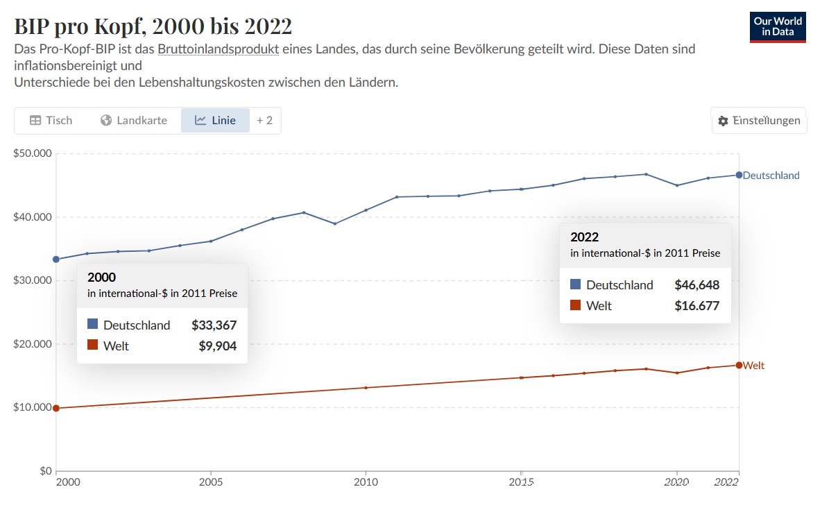 BIP pro Kopf, 2000 – 2020: Na ja, da haben wir es ja wirklich gut. Nicht nur wir. Denn Deutschland steht über dem Rest der Welt. Deutschland, der Vorreiter für alles und für alle. Deshalb kommen sie auch von überall nach Deutschland. Und staatliche Ausgaben dafür (Subventionen) zählen zu den Bestandteilen des BIP.