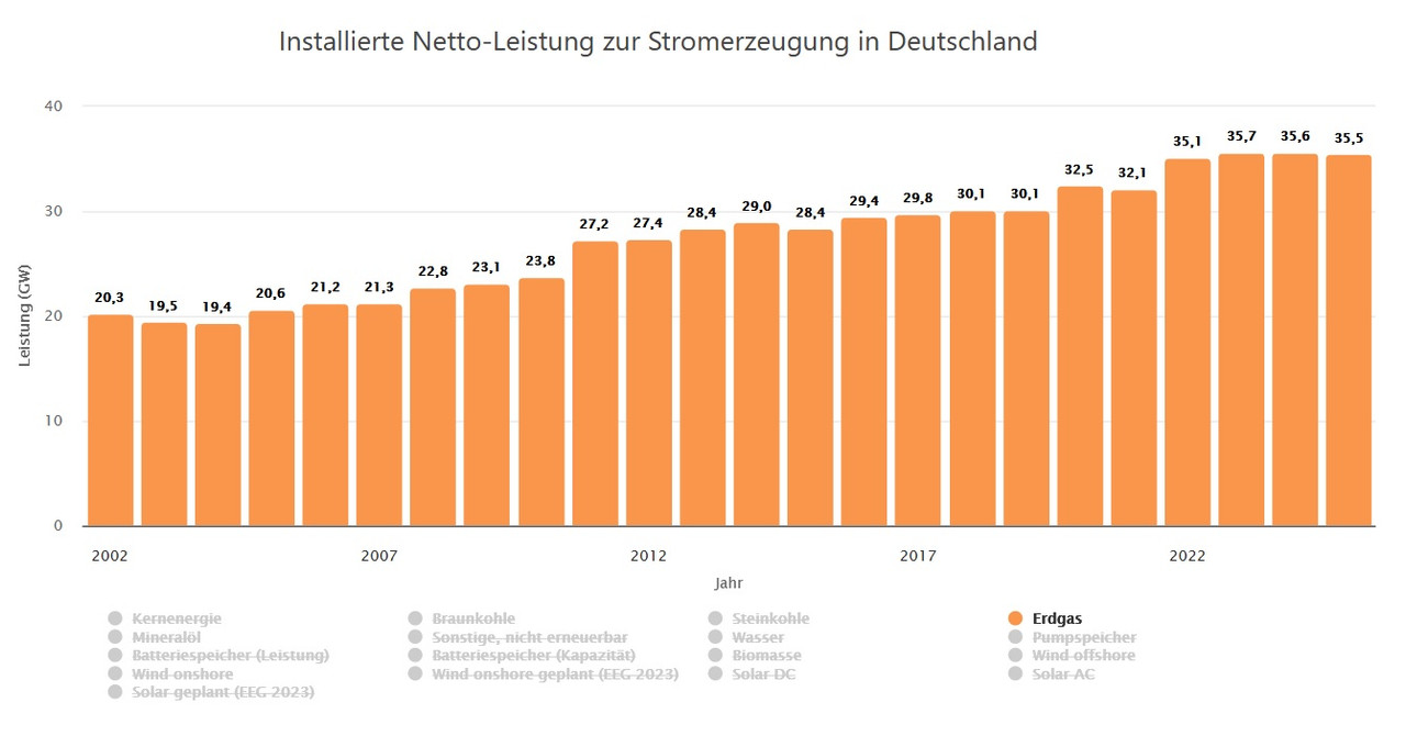 Deutschland ist bei ca. 35 GW bei den Gaskraftwerken und da hat sich in den vergangenen ca. 5 Jahren nichts großartig verändert und da wird sich auch nichts großartig verändern.