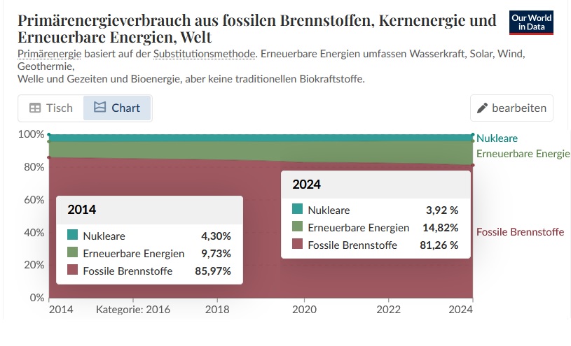 Nur die erneuerbaren haben in den vergangen ca. 10 Jahren ihren Anteil an der weltweiten Primärenergie ausbauen können, um ca. +5,1%.