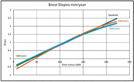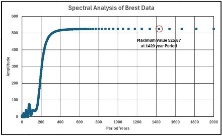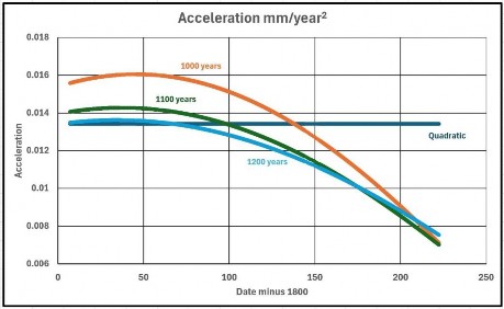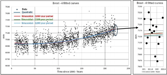Abbildung 3 zeigt einen Spitzenwert (kaum erkennbar) bei einer Periode von 1429 Jahren. Die meisten anderen Gezeitenmessgeräte zeigen viel höhere Perioden, aber es wäre interessant zu sehen, wie Sinuskurven mit Perioden im Bereich von 1000 Jahren mit der quadratischen Anpassung verglichen werden könnten.