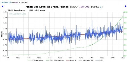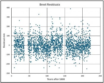 Vor der Analyse dieser 9 Häfen werden die Ergebnisse für Brest untersucht, da diese über 210 Jahre umfassen, obwohl es einige größere Lücken in den Daten gibt. Diese Arbeit wurde bereits früher durchgeführt, aber einige Aspekte sind von Interesse. Die Daten sind in Abbildung 1 dargestellt: