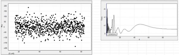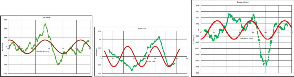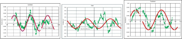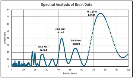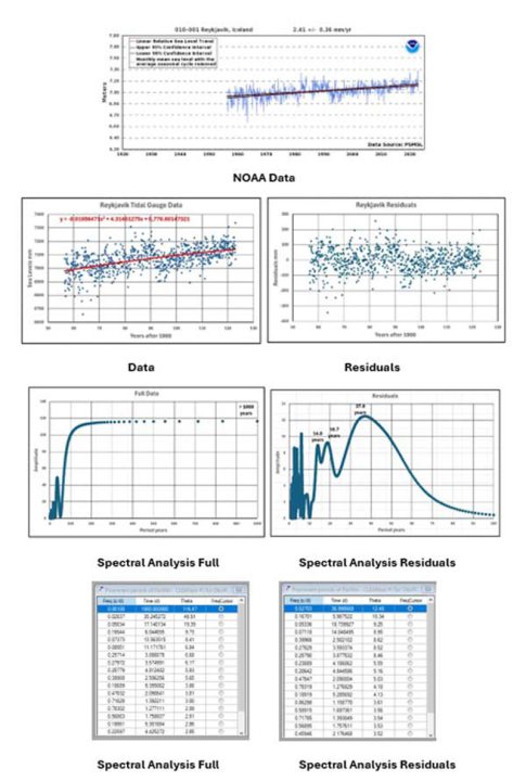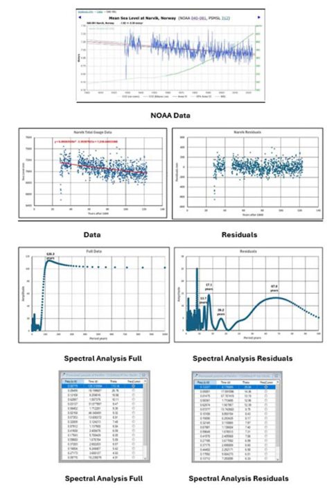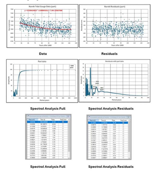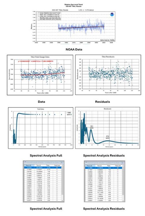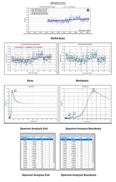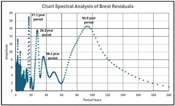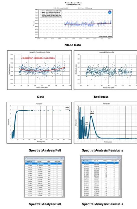 Der erste Eindruck ist etwas beunruhigend, da er Kurven mit Perioden im Bereich von 10 bis 100 Jahren anzeigt, aber bei genauerer Betrachtung zeigt sich, dass diese alle eine geringe Amplitude (in diesen Diagrammen mit „Theta” bezeichnet) von etwa 2 haben, während sie in den tatsächlichen Gezeitenmessdiagrammen zwischen 10 und 30 für die Residuen liegen. Diese Theta-Werte sind relative Werte und geben keine tatsächlichen physikalischen Werte an.