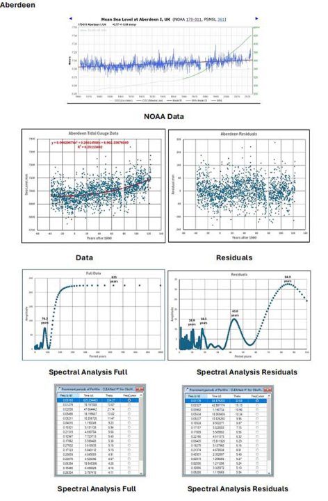 Wenden wir uns nun den 9 Datensätzen der Gezeitenpegel zu, die wir beginnend mit dem längsten Messzeitraum und dann in etwa in der Reihenfolge abnehmender Zeiträume betrachten werden. Bevor wir jedoch fortfahren, zeigen die folgenden 9 kleinen Abbildungen das Ergebnis der früheren Kurvenanpassung einer 26-Jahres-Kurve an die Diagramme der Residualwerte, d. h. der tatsächlichen Werte abzüglich des Wertes der quadratischen Anpassung. Während eine Kurve mit einer Periode von etwa 26 Jahren an vielen Stellen passt, gibt es Hinweise auf andere, in der Regel längere Periodenkomponenten, wie aus dem Diagramm für Aberdeen ersichtlich ist, wo eine größere Schwankung von etwa 85 Jahren offensichtlich ist. Die größeren Spektralanalyse-Peaks beziehen sich auf Primärmodi, während die kürzeren andere Primärmodi oder Sekundärmodi sein können. Ein Problem bei diesen 9 Analysen war, dass die dargestellten Daten ein gleitender Durchschnitt basierend auf 101 Datenpunkten sind. Ohne Unterbrechungen in den Daten entspricht dies etwas mehr als 8 Jahren, aber da es mehrere Lücken in den Daten gibt, kann dies zu Verzerrungen führen. Durch die Mittelwertbildung werden die meisten kurzfristigen Frequenzen entfernt, wodurch die allgemeine Form leichter zu erkennen ist.