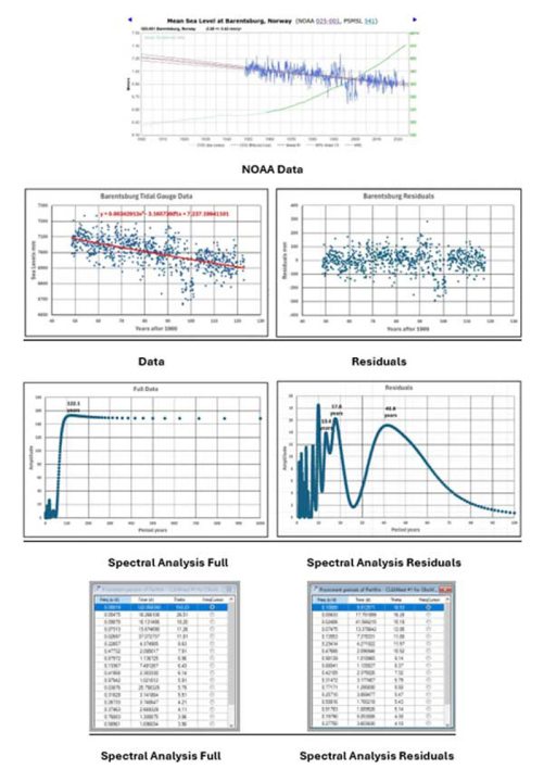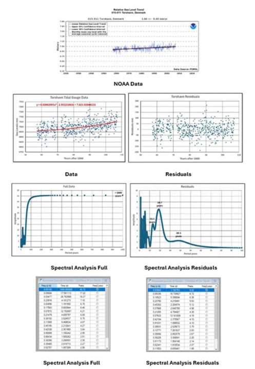 Die Frage „Warum weist der globale Meeresspiegelanstieg eine sinusförmige Schwankung mit einer Periode von etwa 26 Jahren auf?“ wurde 2023 in den Kommentaren zu einer meiner Veröffentlichungen gestellt. In meiner Antwort wies ich darauf hin, dass die Satellitenabdeckung nur 95 % betrug und daher möglicherweise die Ereignisse in den übrigen 5 % relevant sein könnten. In meinem Folgeartikel „Measuring and Analysing Sea Levels using Satellites during 2023 – Part 2“ [etwa: Messung und Analyse des Meeresspiegels mit Satelliten im Jahr 2023 – Teil 2] analysierte ich die Ergebnisse von Gezeitenmessern in 9 Häfen in den nördlichen Regionen des Atlantischen Ozeans und bis hinauf zum Arktischen Ozean. Die Analyse war sehr vereinfacht, aber vielversprechend, sodass nun eine detailliertere Analyse unter Verwendung neuerer Verfahren durchgeführt wird.