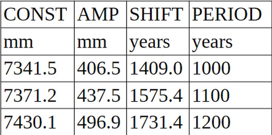 Die Kurvenanpassung wurde für Kurven mit Perioden von 1000, 1100 und 1200 Jahren durchgeführt. Die Gleichungen werden im Excel-Format angezeigt.
