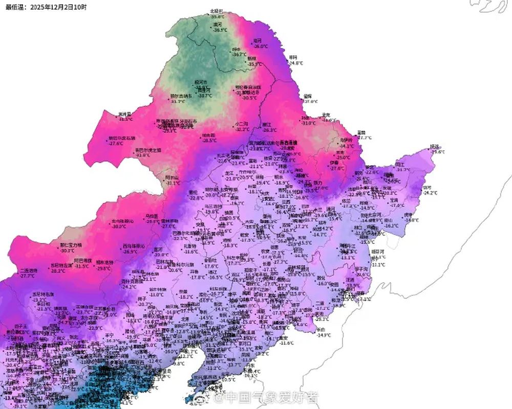 Die nationale Station Tulihe erreichte -38,7 °C, Genhe folgte mit -38,6 °C und Mohe erreichte -36,9 °C. In Hulunbuir City sank die Temperatur auf -31,7 °C, aber die kälteste automatische Messstation der Stadt verzeichnete außergewöhnliche -42,7 °C – Werte unter -40 °C sind in diesen Gegenden vor Mitte Dezember historisch selten.