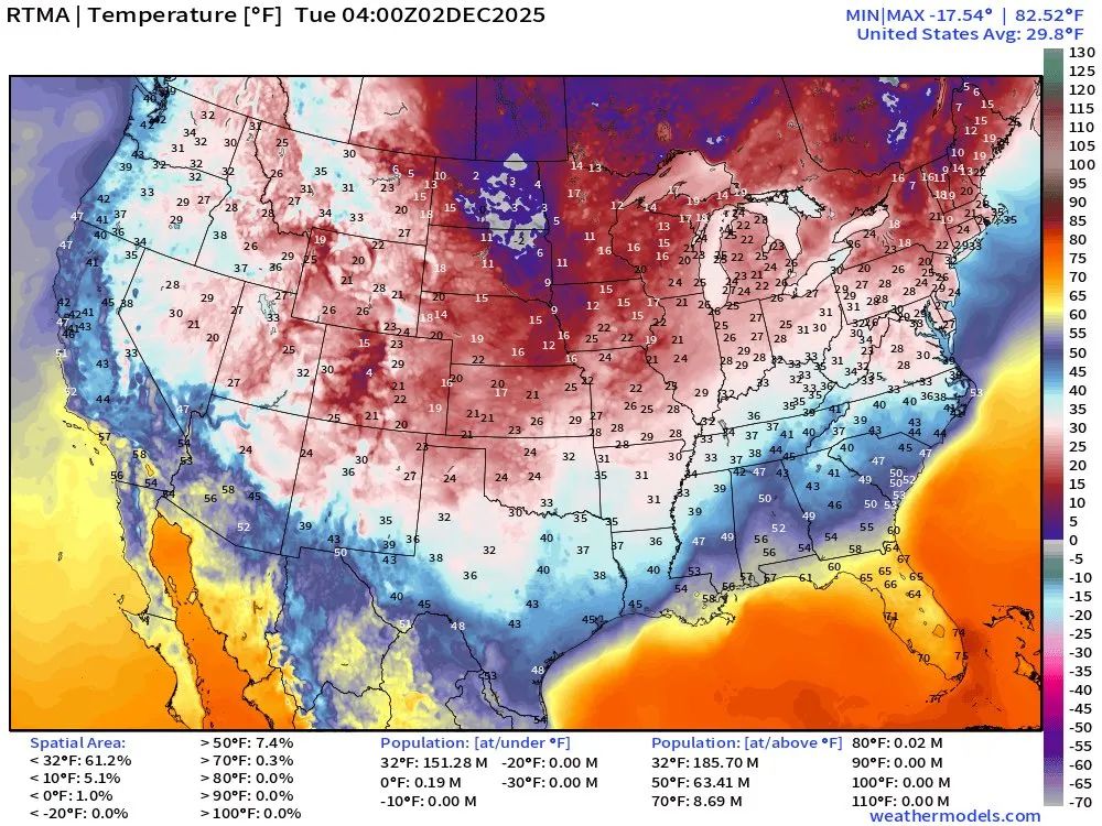 Temperatur am 2. Dezember 2025 um 04 UTC in Grad Fahrenheit. Zur Orientierung: ausgehend von 32°F = 0°C geht es in Schritten von 18°F in beide Richtungen entsprechend 10°C (Beispiel: 32°F – 18 ≅ 0°C – 10.