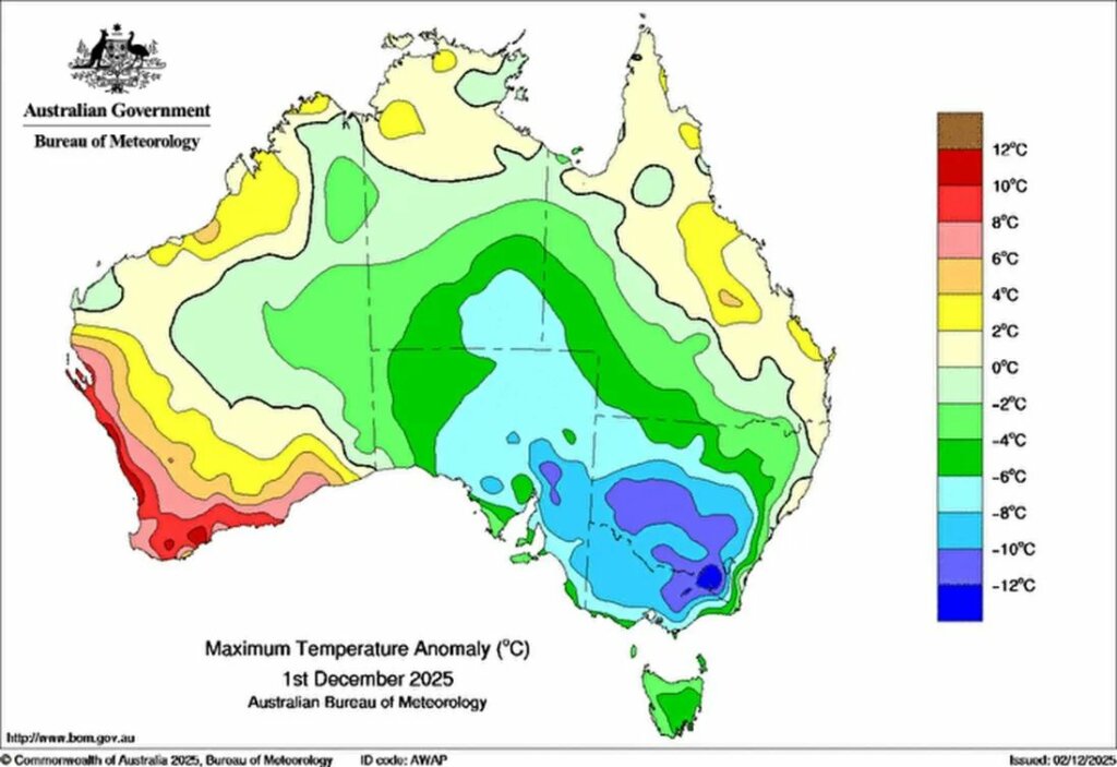 Der Großteil des Landes lag am ersten Sommertag deutlich unter dem Durchschnitt (selbst laut BoM):