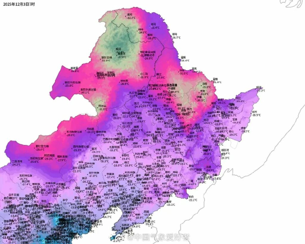 Der frühe Wintereinbruch in China verschärfte sich am Morgen des 3. Dezembers, als arktische Luft tief in den Norden des Landes vordrang. So verzeichnete Genhe mit -37,9 °C den niedrigsten Wert außerhalb eines AWS-Messnetzes.