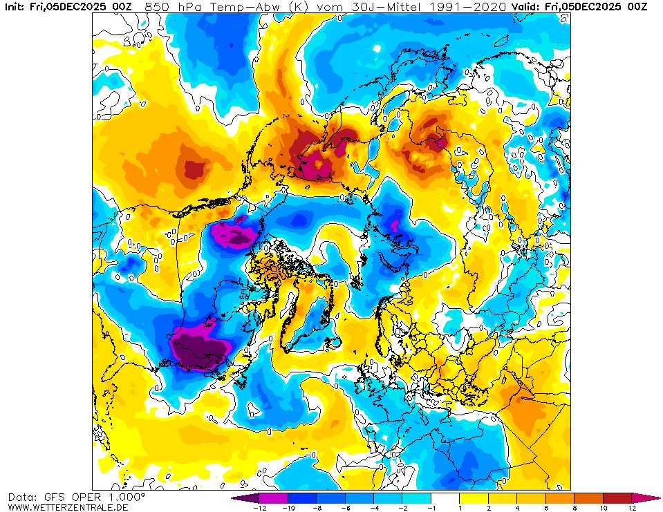 Was sich hingegen nicht geändert hat ist, dass die 500-hPa-Fläche der Nordhemisphäre immer noch irgendwie „zerflattert“ erscheint, das heißt es gibt nicht ein Kältezentrum, sondern mehrere, wobei die Arktis selbst nach wie vor relativ „warm“ daherkommt, wie die Abweichung der Temperatur im 850-hPa-Niveau von heute zeigt (5. Dezember 2025):