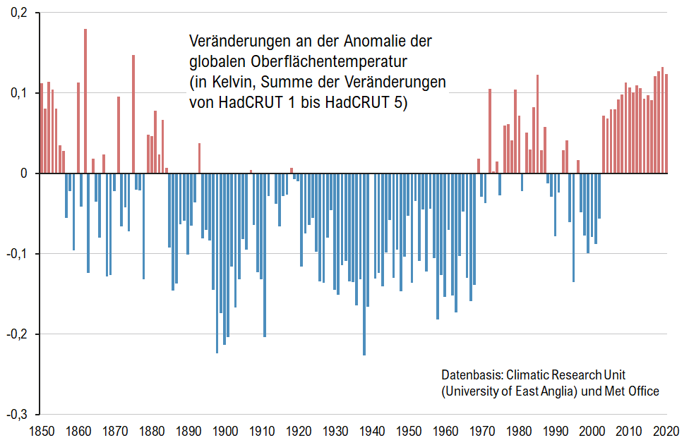Doch, es gibt sehr wohl eine globale Oberflächentemperatur. Irgendwie ein Mittelwert zwischen Wüstensonne und Polarnacht, Südsee und Himalaja. Ob dieser Wert richtig berechnet wurde oder worüber er uns Auskunft geben soll, ist eine andere Angelegenheit. Aber es ist bekanntlich nicht so, daß die einmal ermittelten globale Oberflächentemperaturen feststehen würden. Nein, sie wurden nachträglich immer wieder „angepasst“ (homogenisiert usw.). Hier z.B. die Veränderungen von HadCRUT1 bis HadCRUT5: Die Temperaturen mitte des vorigen Jahrhunderts wurden abgesenkt (dieser Buckel um 1945 störte wohl?), die Temperaturen nach 2000 kräftig angehoben (Wo ist die „Erwärmungspause“?).