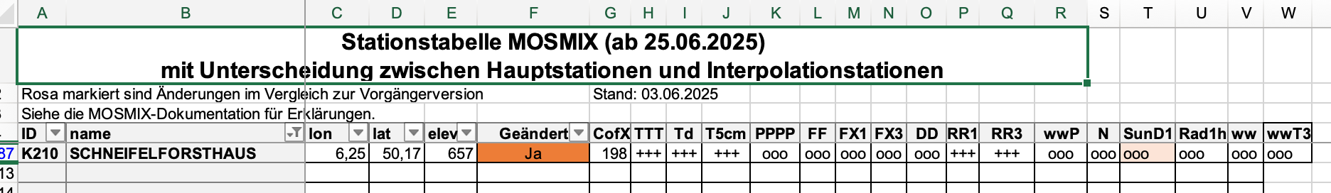 Ich weiß nicht wo die Koordinaten im MOSMIX-Stationskatalog herkommen, zumindest für die Station Schneifelforsthaus stimmen die sicherlich nicht.