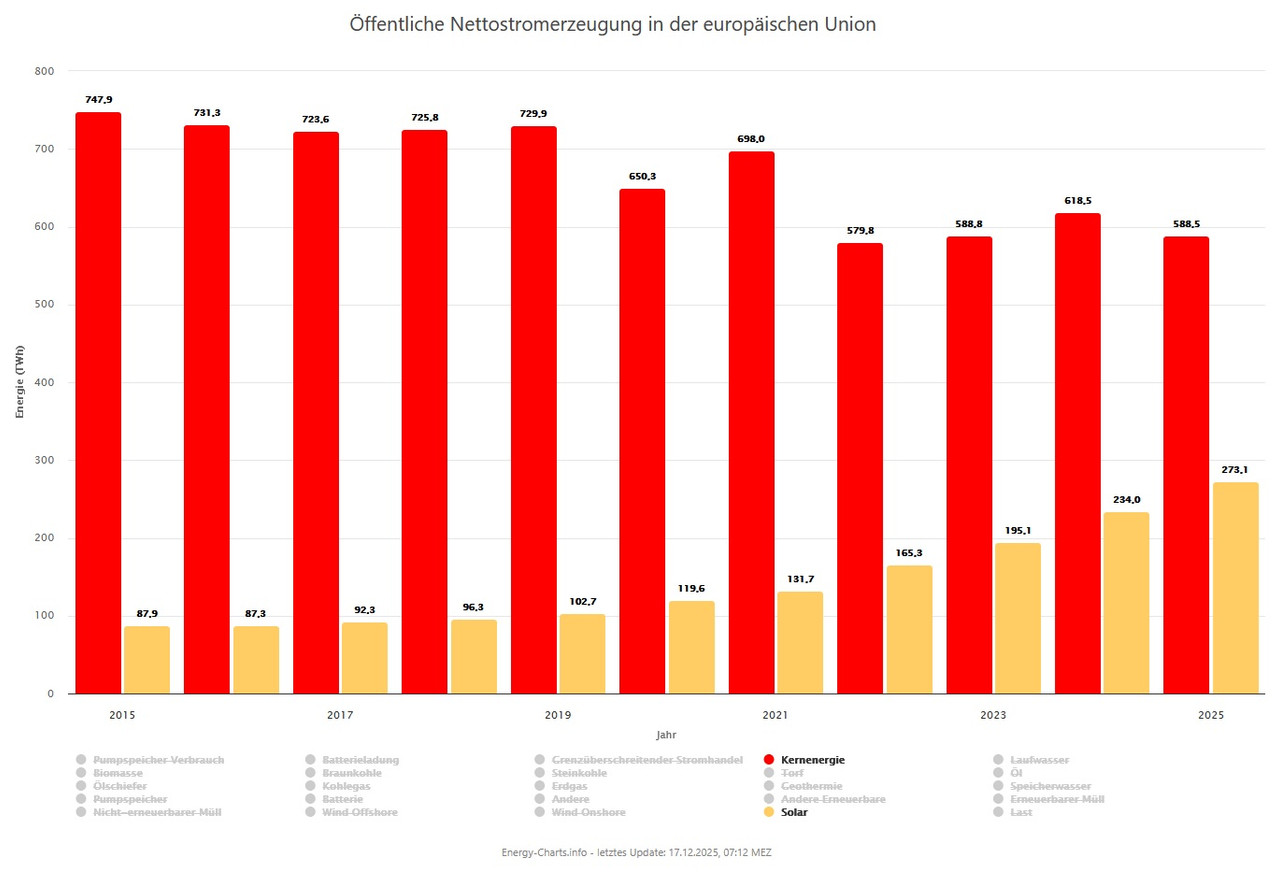 Die TWh aus dem Atomkraftwerken in der EU sind um ca. -20% zurückgegangen.