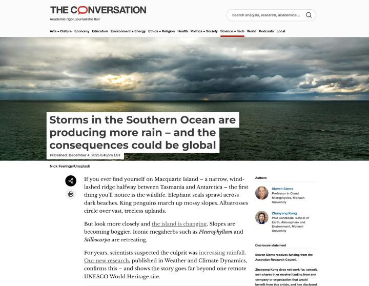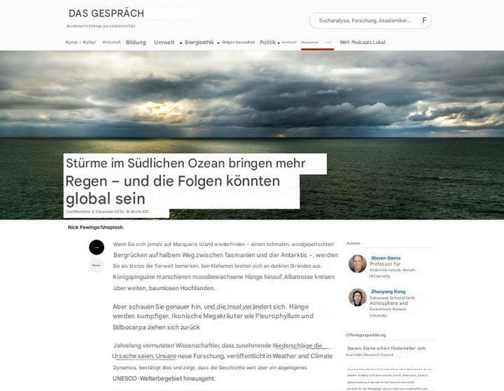 Wissenschaftliche Erkenntnisse gewinnen nicht nur durch Daten an Autorität, sondern auch durch die Art und Weise, wie diese Daten präsentiert werden. Die Veröffentlichung von Kong und Kollegen aus dem Jahr 2025 mit dem Titel „Intensifying precipitation over the Southern Ocean challenges reanalysis-based climate estimates – Insights from Macquarie Island’s 45-year record” (Etwa: Zunehmende Niederschläge über dem Südlichen Ozean stellen reanalysebasierte Klimaprognosen infrage – Erkenntnisse aus den 45-jährigen Aufzeichnungen von Macquarie Island) ist ein hervorragendes Beispiel dafür, wie ein kleines, unsicheres Ergebnis durch die Pressemitteilung zu einer weitreichenden globalen Aussage werden kann.