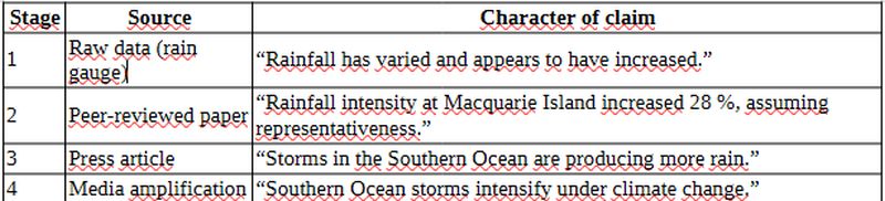 Von da an entfaltet sich die Logik eher durch Implikation als durch Beweise. Da der Südliche Ozean „eine enorme Rolle im globalen Klimasystem spielt“, muss jede Veränderung auf Macquarie Island eine größere Transformation reflektieren. Die Autoren, die nun zu Kommunikatoren geworden sind, erklären dann:
