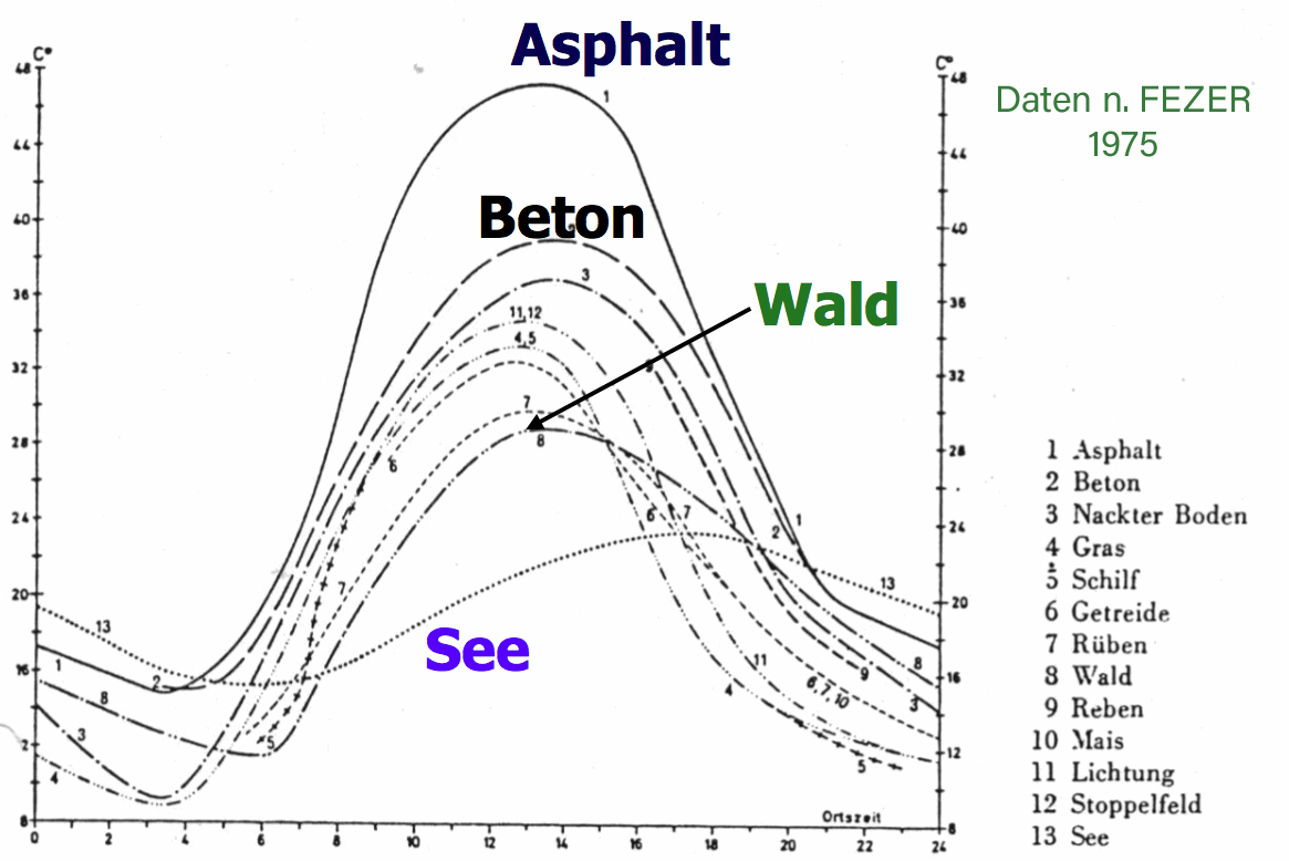 Landschaftsökologen durften sich in meiner universitären Ausbildung noch mit Tagesgängen der Temperaturen über diversen Substraten beschäftigen (z.B. s.Abb.) und haben nie ein Problem gehabt den UHI- Effekt als klimarelevant zu begreifen. Sehr schade ist es, wenn Schüler heute nicht mehr Geländepraktika machen (müssen), wo sie vergleichbare Daten erheben und auswerten, vielleicht in Verbindung mit phänologischen Feldstudien. In meiner Jugend waren das noch Events – nicht nur freitags grins! Es wurden und werden in den Schulen oft nur noch modellierbare bzw. modellierte Fragen und Antworten gesucht und in der Literatur gefunden. Mich wundert es nicht, wenn der Forstwissenschaftler Andreas Schulte dann gerne seine Erkenntnis formuliert: if ideology is master, you reach desaster faster! Ob KI dem ein Ende setzt?