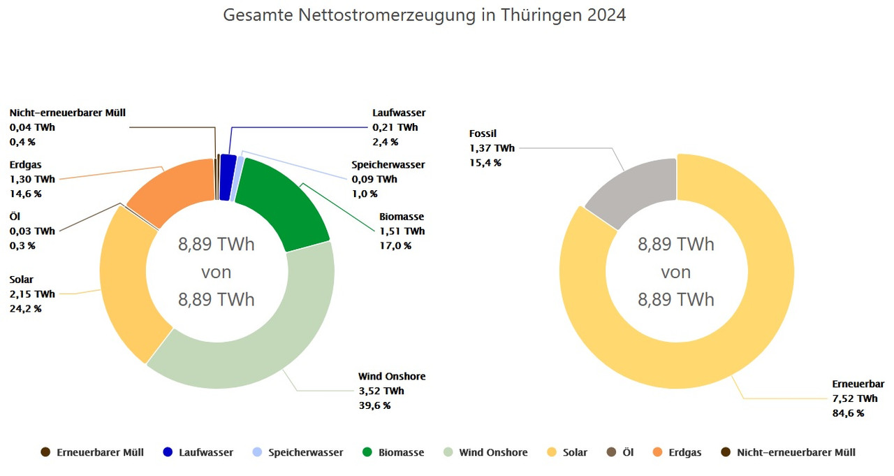 Von der gesamte Nettostromerzeugung in Thüringen 2024 stammen ca. 85% bereits aus den Erneuerbaren, das sollte Thüringen konsequent weiter ausbauen.
